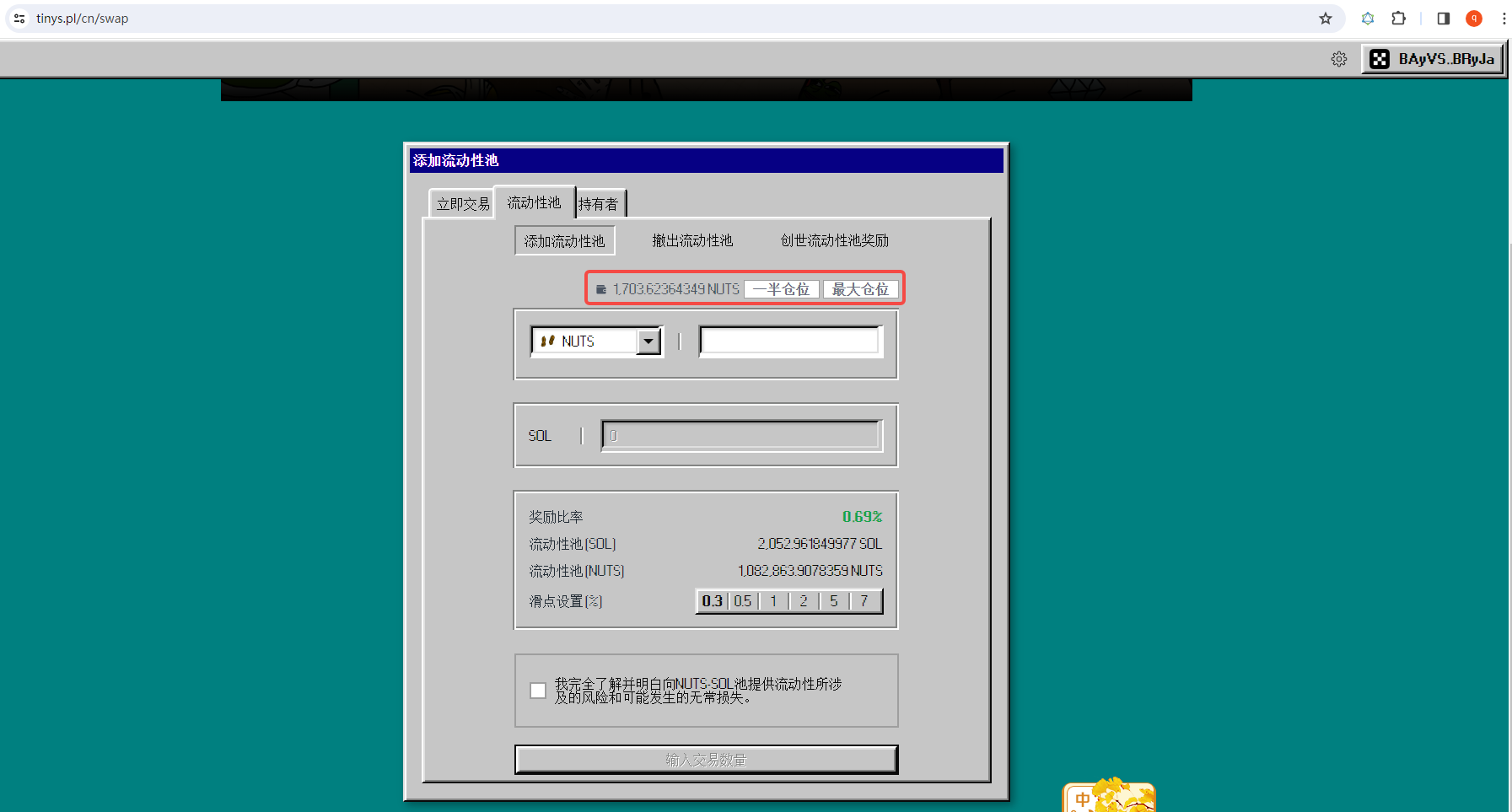 3、在 https://tinys.pl/cn/swap 中重新连接钱包,添加流动性池,终于看见了 1,703.62364349 NUTS。这应该就是我钱包中的 NUTS 的余额了。符合预期。如图3