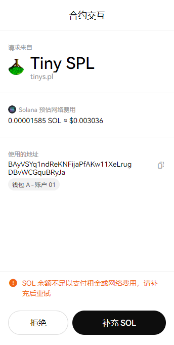 5、提示:SOL余额不足以支付租金或网络费用,请补充后重试。如图5