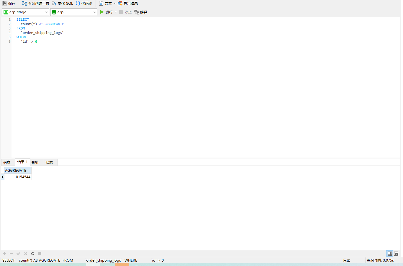 1、参考:在 MySQL 8.0 中,查询表记录总数时,超时的分析优化。 在 Navicat 中的执行时长为:3.075秒。如图1