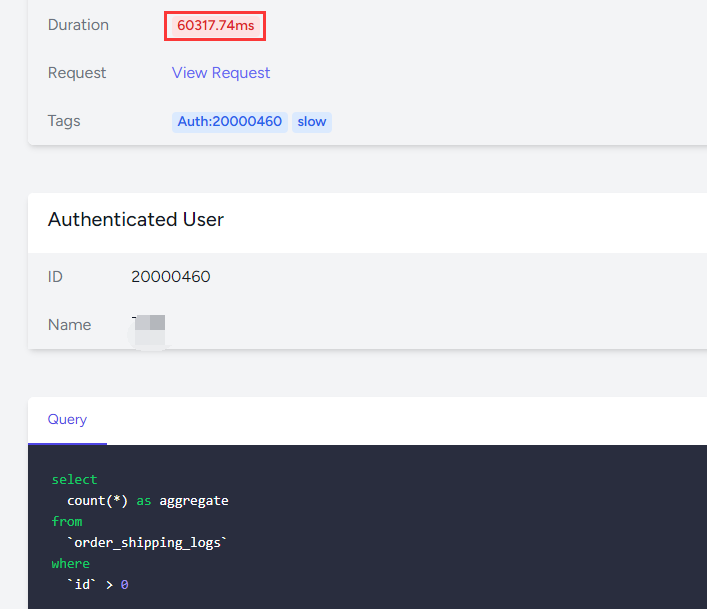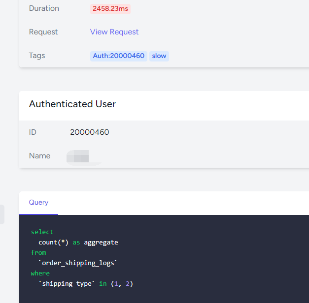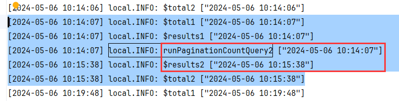 6、最终确认,在 vendor/laravel/framework/src/Illuminate/Database/Query/Builder.php ,方法 runPaginationCountQuery 执行了 60 秒。这是框架底层的实现,暂不好解决。决定使用 where `shipping_type` in (1, 2)。SQL 执行时长为 3 秒左右,符合预期。以下为打印的日志,以确认 方法 runPaginationCountQuery 执行时间。其中 runPaginationCountQuery2 与 $results2 之间的时间,为 如下代码的执行时间。如图6、图7
