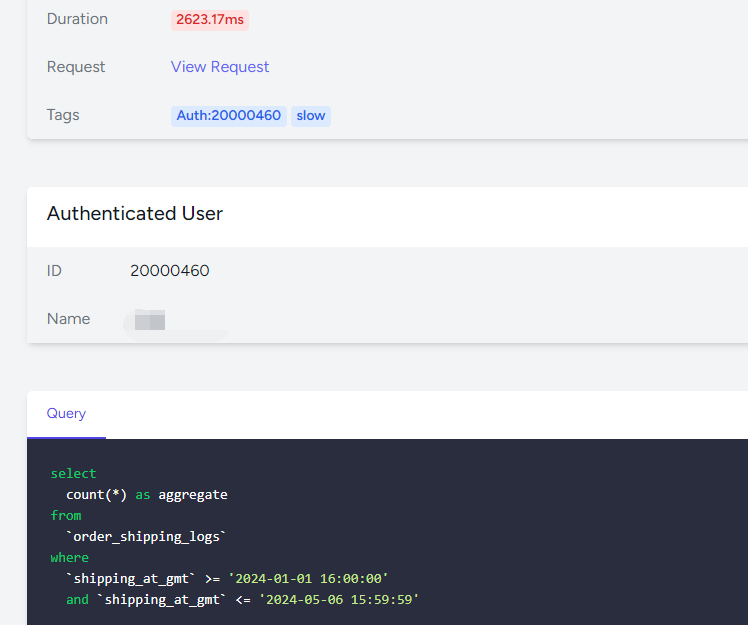 3、验证另一个 count(*) SQL,在 Laravel 9 中的执行时长为:2623.17ms。其相当于 2.6秒。虽然其查询结果与上面的查询结果是相同的。但是,执行时长只有上面 SQL 的 5%。如图3