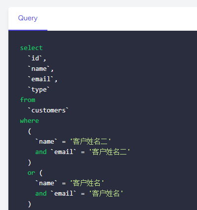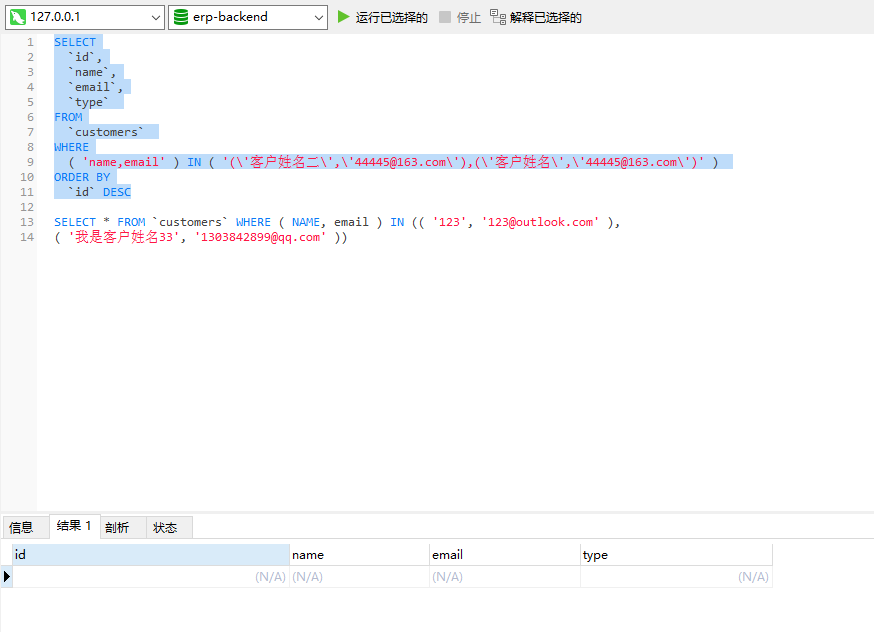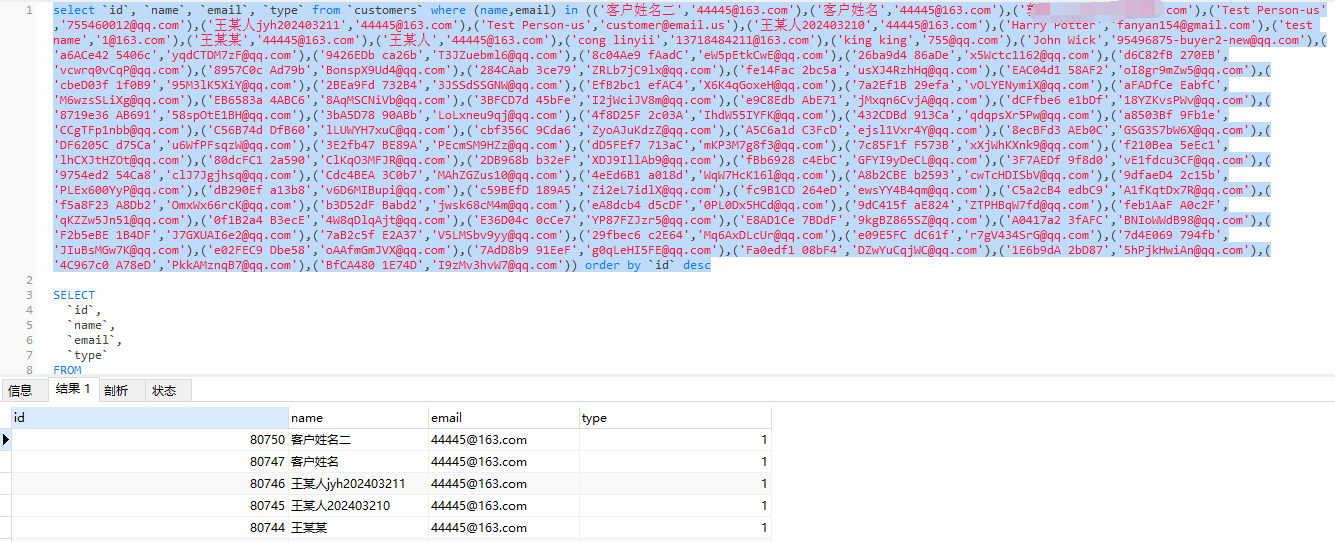 SELECT `id`, `name`, `email`, `type` FROM `customers` WHERE ( 'name,email' ) IN ( '(\'客户姓名二\',\'44445@163.com\'),(\'客户姓名\',\'44445@163.com\')' ) ORDER BY `id` DESC