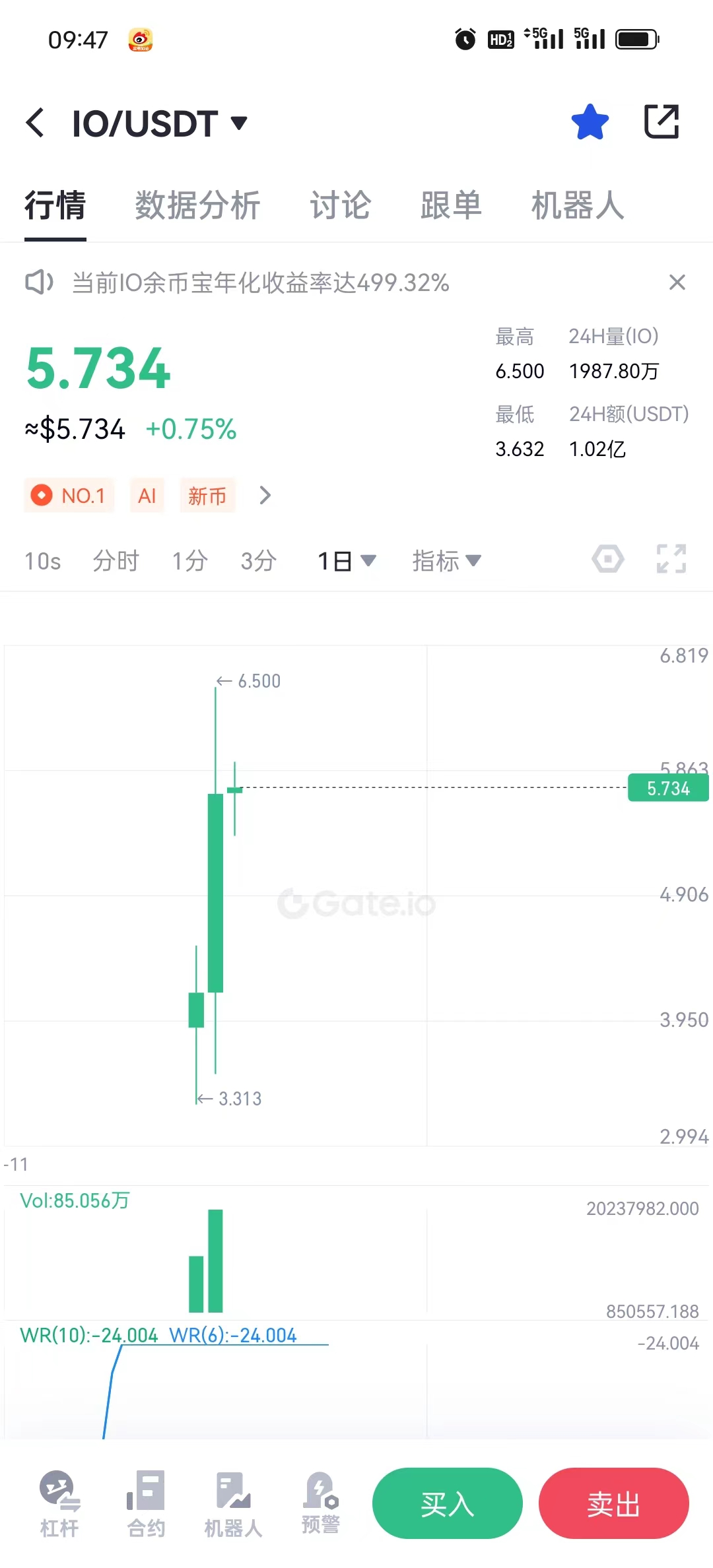 4、在 2024/06/11 的时间,上市币安、Gate 等中心化交易所。在 2024/06/13,发现价格为 5.734 U 一枚。那么净收益为:(5.734-0.75) / 0.75 * 2500 = 16613 U。净收益率为 6.65 倍。如图4