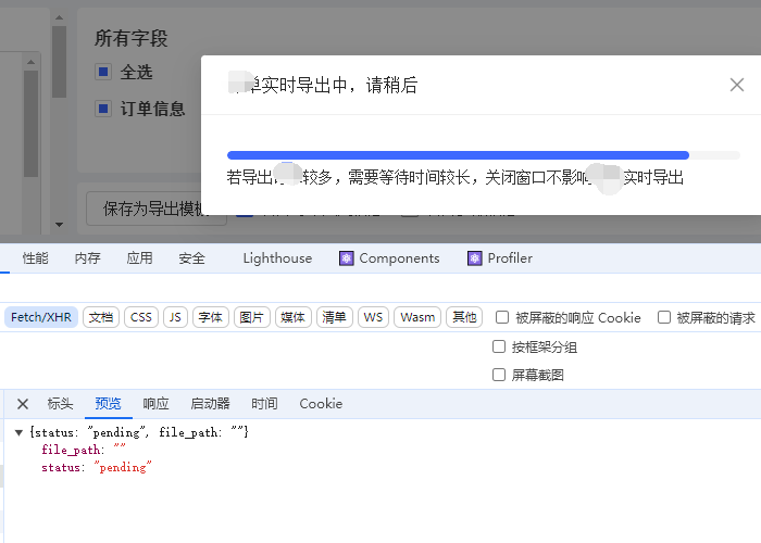 1、现在的 Excel 导出进度是由前端自行显示的,并未受到后端的控制。如图1