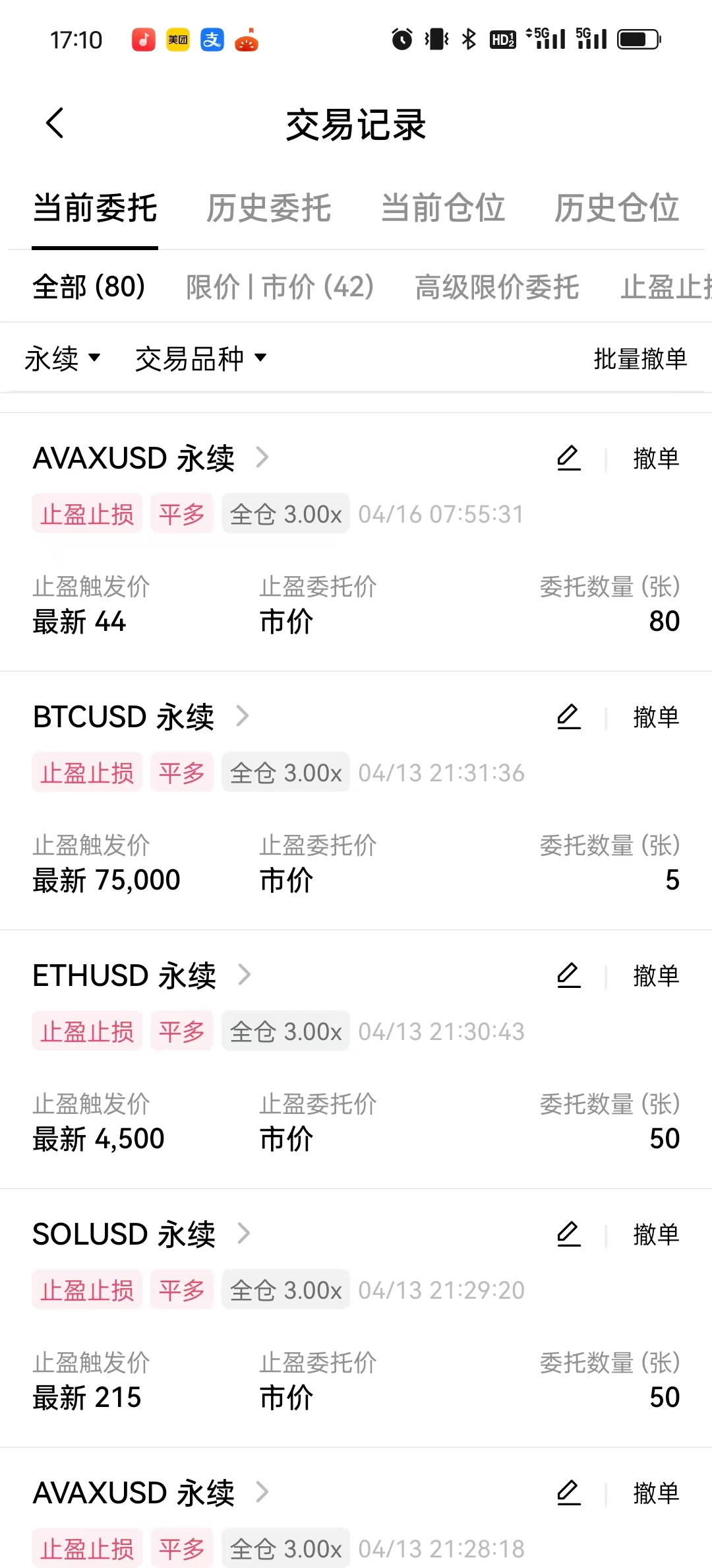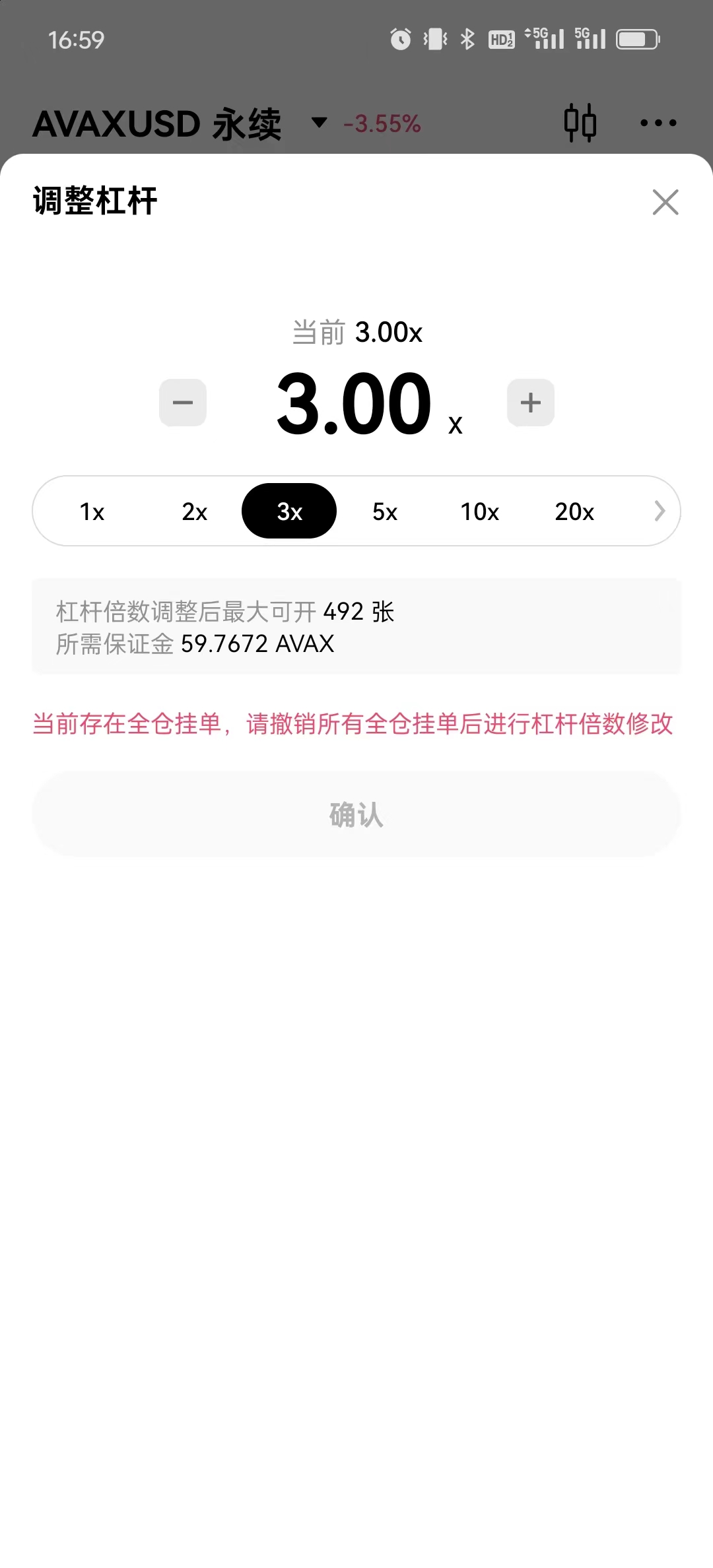 在欧易中调整 AVAXUSD 永续 杠杆,提示:当前存在全仓挂单,请撤销所有全仓挂单后进行杠杆倍数修改