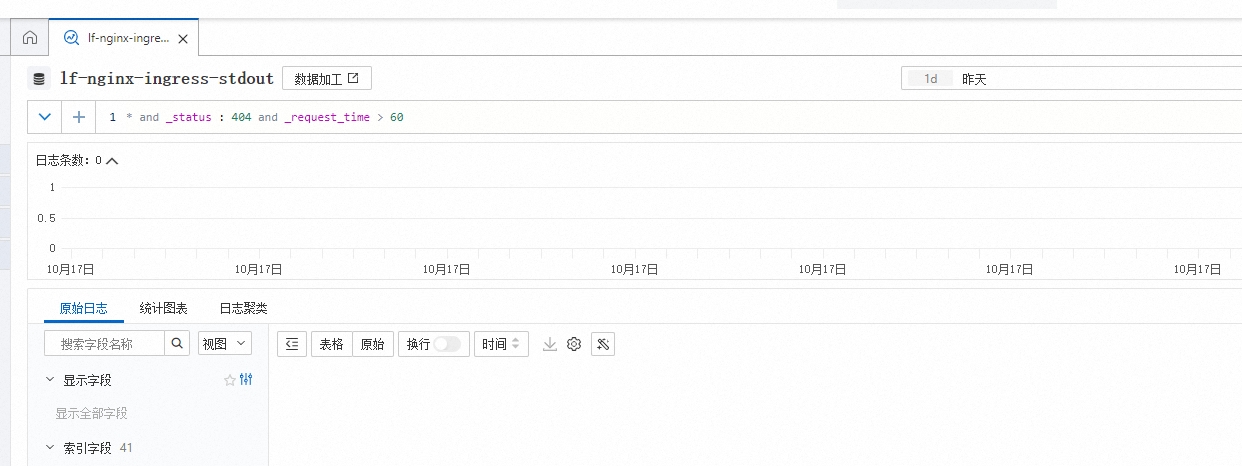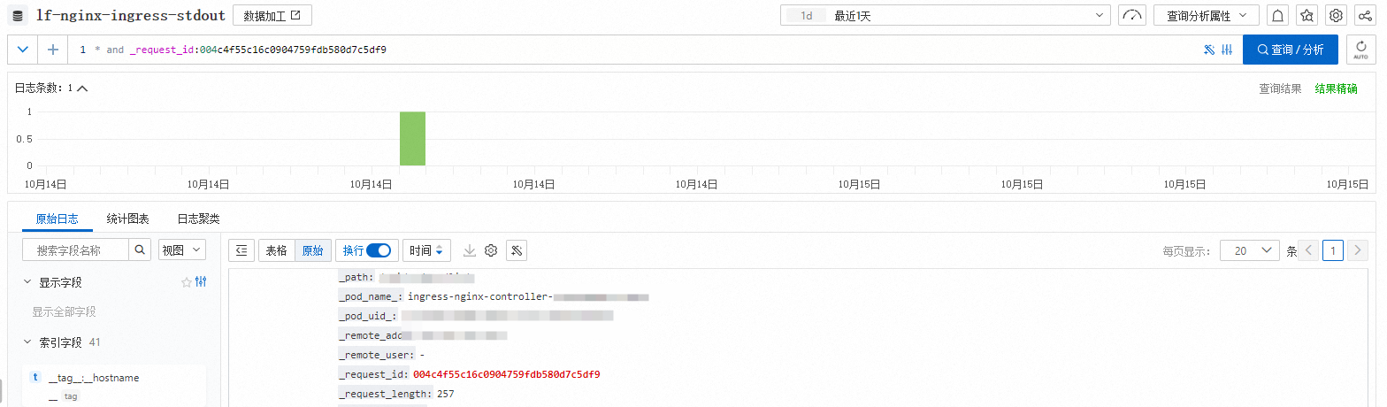 2、基于 _request_id:004c4f55c16c0904759fdb580d7c5df9 查询 ingress-nginx 的日志,ingress-nginx-controller 存在 一条记录(10-14 16:01:33),响应 404。如图2
