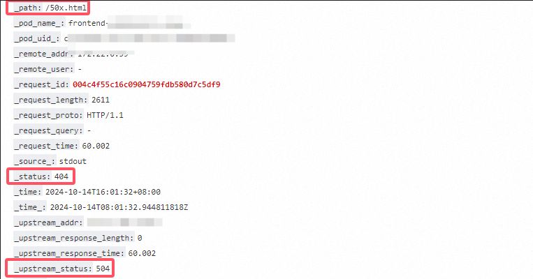 3、基于 _request_id:004c4f55c16c0904759fdb580d7c5df9 查询 Frontend Service 的日志,Frontend Service 存在 一条记录(10-14 16:01:33),请求 /50x.html ,响应 404,_upstream_status:504,表示 Backend Service 响应 504。如图3
