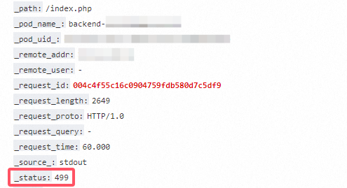 4、基于 _request_id:004c4f55c16c0904759fdb580d7c5df9 查询 Backend Service 的日志,Backend Service 存在 一条记录(10-14 16:01:33),响应为 504,由于 Frontend Service 主动断开连接,记录的实际响应 499。如图4
