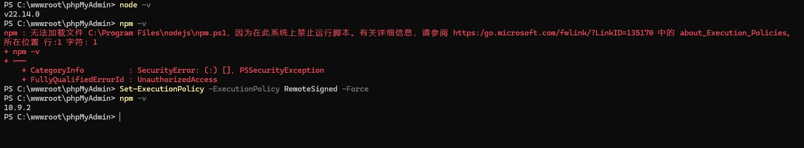 PS C:\wwwroot\phpMyAdmin> Set-ExecutionPolicy -ExecutionPolicy RemoteSigned -Force PS C:\wwwroot\phpMyAdmin> npm -v 10.9.2 PS C:\wwwroot\phpMyAdmin>