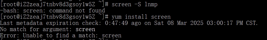 [root@iZ2zeaj7tnbv8d3gsoy1w5Z ~]# screen -S lnmp -bash: screen: command not found [root@iZ2zeaj7tnbv8d3gsoy1w5Z ~]# yum install screen Last metadata expiration check: 0:47:49 ago on Sat 08 Mar 2025 03:00:17 PM CST. No match for argument: screen Error: Unable to find a match: screen [root@iZ2zeaj7tnbv8d3gsoy1w5Z ~]# dnf install screen Last metadata expiration check: 0:50:52 ago on Sat 08 Mar 2025 03:00:17 PM CST. No match for argument: screen Error: Unable to find a match: screen