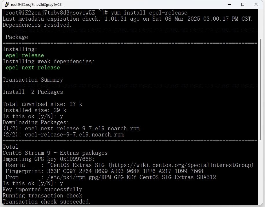 [root@iZ2zeaj7tnbv8d3gsoy1w5Z ~]# yum install epel-release Last metadata expiration check: 1:01:31 ago on Sat 08 Mar 2025 03:00:17 PM CST. Dependencies resolved. ======================================================================================================================================================================================================================================================================================================================= Package Architecture Version Repository Size ======================================================================================================================================================================================================================================================================================================================= Installing: epel-release noarch 9-7.el9 extras-common 19 k Installing weak dependencies: epel-next-release noarch 9-7.el9 extras-common 8.1 k Transaction Summary ======================================================================================================================================================================================================================================================================================================================= Install 2 Packages Total download size: 27 k Installed size: 29 k Is this ok [y/N]: y Downloading Packages: (1/2): epel-next-release-9-7.el9.noarch.rpm 71 kB/s | 8.1 kB 00:00 (2/2): epel-release-9-7.el9.noarch.rpm 131 kB/s | 19 kB 00:00 ----------------------------------------------------------------------------------------------------------------------------------------------------------------------------------------------------------------------------------------------------------------------------------------------------------------------- Total 183 kB/s | 27 kB 00:00 CentOS Stream 9 - Extras packages 2.0 MB/s | 2.1 kB 00:00 Importing GPG key 0x1D997668: Userid : "CentOS Extras SIG (https://wiki.centos.org/SpecialInterestGroup) <security@centos.org>" Fingerprint: 363F C097 2F64 B699 AED3 968E 1FF6 A217 1D99 7668 From : /etc/pki/rpm-gpg/RPM-GPG-KEY-CentOS-SIG-Extras-SHA512 Is this ok [y/N]: y Key imported successfully Running transaction check Transaction check succeeded. Running transaction test Transaction test succeeded. Running transaction Preparing : 1/1 Installing : epel-release-9-7.el9.noarch 1/2 Running scriptlet: epel-release-9-7.el9.noarch 1/2 Many EPEL packages require the CodeReady Builder (CRB) repository. It is recommended that you run /usr/bin/crb enable to enable the CRB repository. Installing : epel-next-release-9-7.el9.noarch 2/2 Running scriptlet: epel-next-release-9-7.el9.noarch 2/2 Verifying : epel-next-release-9-7.el9.noarch 1/2 Verifying : epel-release-9-7.el9.noarch 2/2 Installed: epel-next-release-9-7.el9.noarch epel-release-9-7.el9.noarch Complete! [root@iZ2zeaj7tnbv8d3gsoy1w5Z ~]# yum install screen Extra Packages for Enterprise Linux 9 - x86_64 14 MB/s | 23 MB 00:01 Extra Packages for Enterprise Linux 9 openh264 (From Cisco) - x86_64 1.4 kB/s | 2.5 kB 00:01 Extra Packages for Enterprise Linux 9 - Next - x86_64 232 kB/s | 235 kB 00:01 Dependencies resolved. ======================================================================================================================================================================================================================================================================================================================= Package Architecture Version Repository Size ======================================================================================================================================================================================================================================================================================================================= Installing: screen x86_64 4.8.0-6.el9 epel 649 k Transaction Summary ======================================================================================================================================================================================================================================================================================================================= Install 1 Package Total download size: 649 k Installed size: 957 k Is this ok [y/N]: y Downloading Packages: screen-4.8.0-6.el9.x86_64.rpm 5.2 MB/s | 649 kB 00:00 ----------------------------------------------------------------------------------------------------------------------------------------------------------------------------------------------------------------------------------------------------------------------------------------------------------------------- Total 816 kB/s | 649 kB 00:00 Extra Packages for Enterprise Linux 9 - x86_64 1.6 MB/s | 1.6 kB 00:00 Importing GPG key 0x3228467C: Userid : "Fedora (epel9) <epel@fedoraproject.org>" Fingerprint: FF8A D134 4597 106E CE81 3B91 8A38 72BF 3228 467C From : /etc/pki/rpm-gpg/RPM-GPG-KEY-EPEL-9 Is this ok [y/N]: y Key imported successfully Running transaction check Transaction check succeeded. Running transaction test Transaction test succeeded. Running transaction Preparing : 1/1 Running scriptlet: screen-4.8.0-6.el9.x86_64 1/1 Installing : screen-4.8.0-6.el9.x86_64 1/1 Running scriptlet: screen-4.8.0-6.el9.x86_64 1/1 Verifying : screen-4.8.0-6.el9.x86_64 1/1 Installed: screen-4.8.0-6.el9.x86_64 Complete! [root@iZ2zeaj7tnbv8d3gsoy1w5Z ~]#