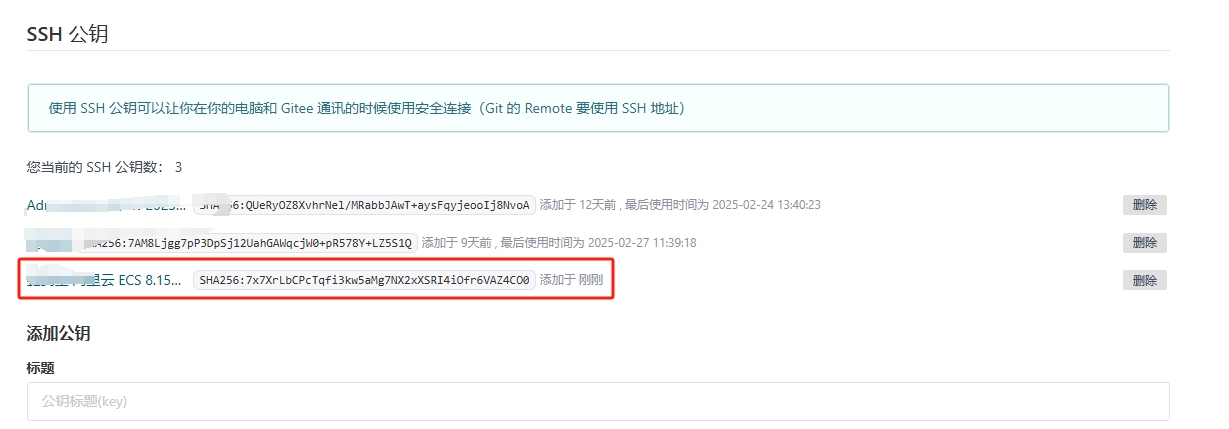 6、安装 Git,基于 Gitee 部署。配置 SSH 密钥 在服务器上生成 SSH 密钥: