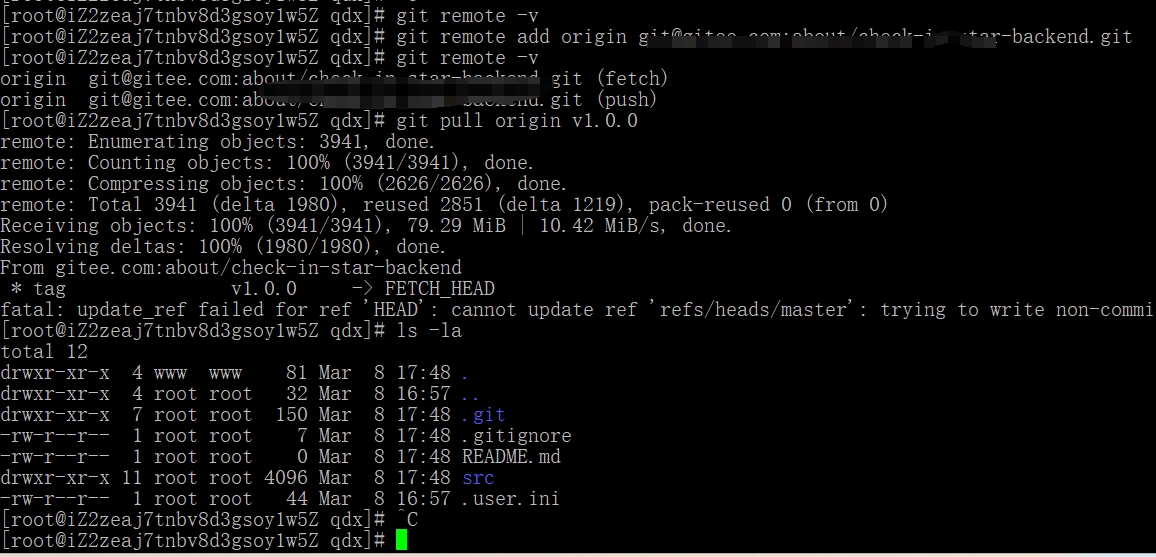 [root@iZ2zeaj7tnbv8d3gsoy1w5Z object]# git clone git@gitee.com:about/check-in-star-backend.git .