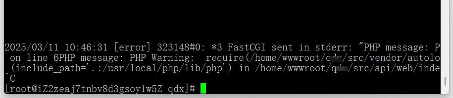 2025/03/11 10:46:31 [error] 323148#0: *3 FastCGI sent in stderr: "PHP message: PHP Warning: require(): open_basedir restriction in effect. File(/home/wwwroot/object/src/vendor/autoload.php) is not within the allowed path(s): (/home/wwwroot/object/src/api/web/:/tmp/:/proc/) in /home/wwwroot/object/src/api/web/index.php on line 6PHP message: PHP Warning: require(/home/wwwroot/object/src/vendor/autoload.php): failed to open stream: Operation not permitted in /home/wwwroot/object/src/api/web/index.php on line 6PHP message: PHP Fatal error: require(): Failed opening required '/home/wwwroot/object/src/api/web/../../vendor/autoload.php' (include_path='.:/usr/local/php/lib/php') in /home/wwwroot/object/src/api/web/index.php on line 6" while reading response header from upstream, client: 101.204.100.38, server: objectapi.ikhw.cn, request: "POST /unregistered-user/get-id HTTP/1.1", upstream: "fastcgi://unix:/tmp/php-cgi.sock:", host: "objectapi.ikhw.cn"