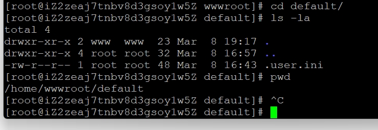 [root@iZ2zeaj7tnbv8d3gsoy1w5Z wwwroot]# cd default/ [root@iZ2zeaj7tnbv8d3gsoy1w5Z default]# ls -la total 4 drwxr-xr-x 2 www www 23 Mar 8 19:17 . drwxr-xr-x 4 root root 32 Mar 8 16:57 .. -rw-r--r-- 1 root root 48 Mar 8 16:43 .user.ini [root@iZ2zeaj7tnbv8d3gsoy1w5Z default]# pwd /home/wwwroot/default [root@iZ2zeaj7tnbv8d3gsoy1w5Z default]#