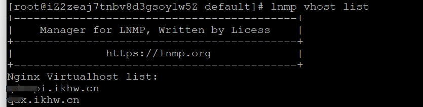[root@iZ2zeaj7tnbv8d3gsoy1w5Z default]# lnmp vhost list +-------------------------------------------+ | Manager for LNMP, Written by Licess | +-------------------------------------------+ | https://lnmp.org | +-------------------------------------------+ Nginx Virtualhost list: objectapi.ikhw.cn object.ikhw.cn