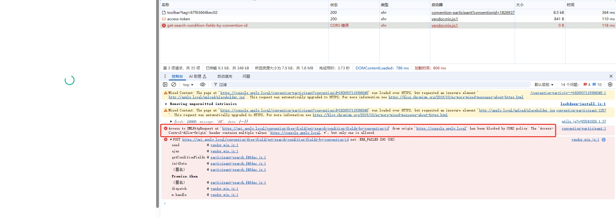 Access to XMLHttpRequest at 'https://api.apply.local/convention-free-field/get-search-condition-fields-by-convention-id' from origin 'https://console.apply.local' has been blocked by CORS policy: The 'Access-Control-Allow-Origin' header contains multiple values 'https://console.apply.local, *', but only one is allowed.