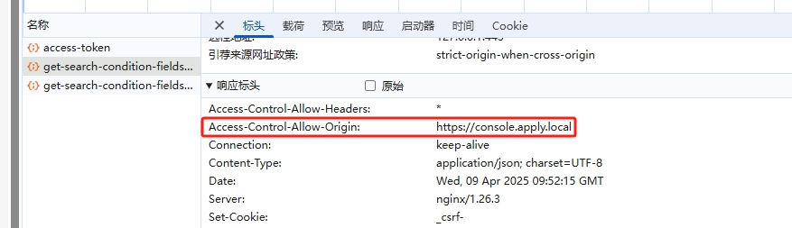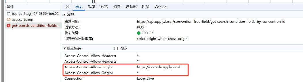 3、仔细分析请求的响应头,access-control-allow-origin: *,覆盖了 setAllowOrigin 方法中设置的 access-control-allow-origin: https://console.apply.local。 如图2