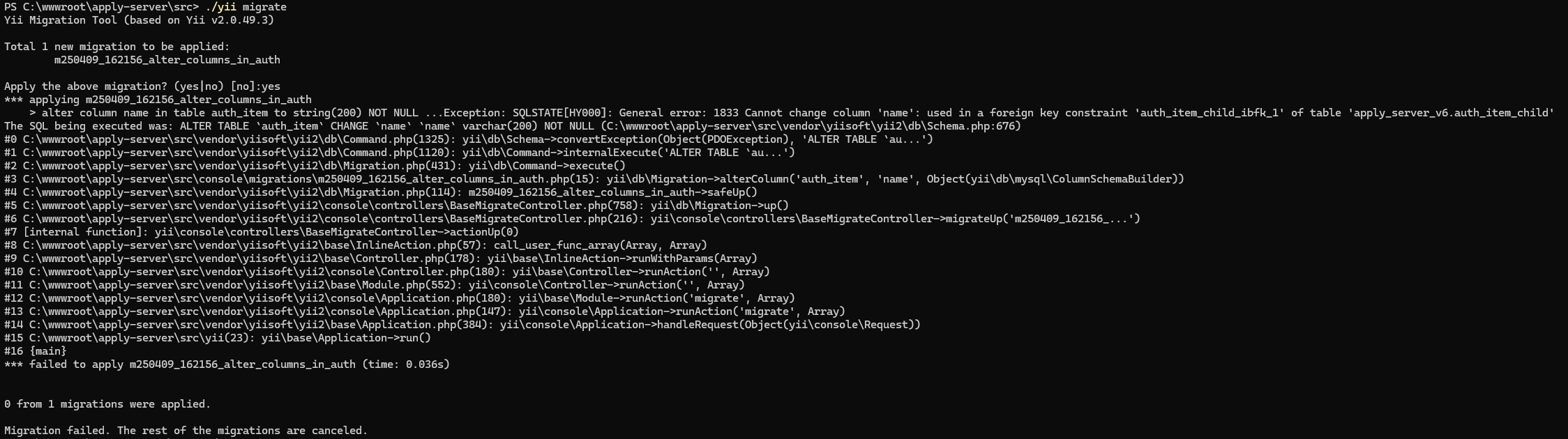 #4 C:\wwwroot\object\src\vendor\yiisoft\yii2\db\Migration.php(114): m250409_162156_alter_columns_in_auth->safeUp()