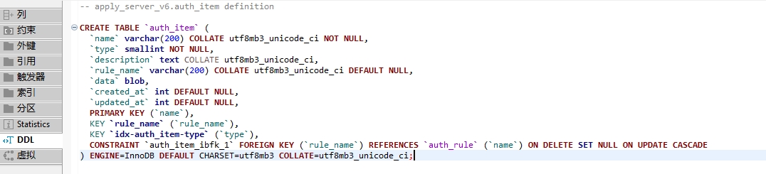 > alter column name in table auth_item to string(200) NOT NULL ...Exception: SQLSTATE[HY000]: General error: 1833 Cannot change column 'name': used in a foreign key constraint 'auth_item_child_ibfk_1' of table 'apply_server_v6.auth_item_child'