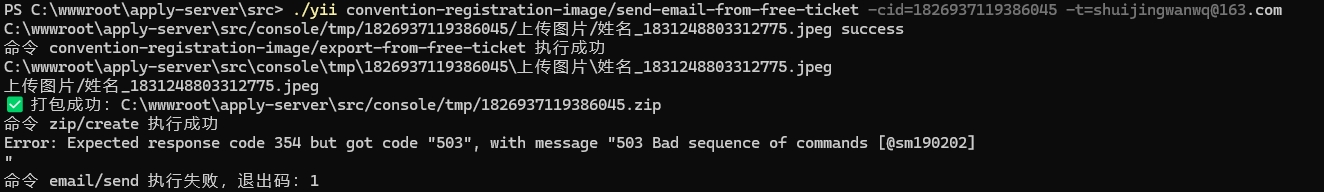 PS C:\wwwroot\object\src> ./yii convention-registration-image/send-email-from-free-ticket -cid=1826937119386045 -t=shuijingwanwq@163.com C:\wwwroot\object\src/console/tmp/1826937119386045/上传图片/姓名_1831248803312775.jpeg success 命令 convention-registration-image/export-from-free-ticket 执行成功 C:\wwwroot\object\src\console\tmp\1826937119386045\上传图片\姓名_1831248803312775.jpeg 上传图片/姓名_1831248803312775.jpeg ✅ 打包成功:C:\wwwroot\object\src/console/tmp/1826937119386045.zip 命令 zip/create 执行成功 Error: Expected response code 354 but got code "503", with message "503 Bad sequence of commands [@sm190202] " 命令 email/send 执行失败,退出码:1