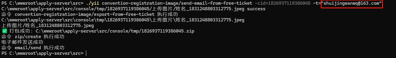 PS C:\wwwroot\object\src> ./yii convention-registration-image/send-email-from-free-ticket -cid=1826937119386045 -t="shuijingwanwq@163.com" C:\wwwroot\object\src/console/tmp/1826937119386045/上传图片/姓名_1831248803312775.jpeg success 命令 convention-registration-image/export-from-free-ticket 执行成功 C:\wwwroot\object\src\console\tmp\1826937119386045\上传图片\姓名_1831248803312775.jpeg 上传图片/姓名_1831248803312775.jpeg ✅ 打包成功:C:\wwwroot\object\src/console/tmp/1826937119386045.zip 命令 zip/create 执行成功 电子邮件发送成功 命令 email/send 执行成功