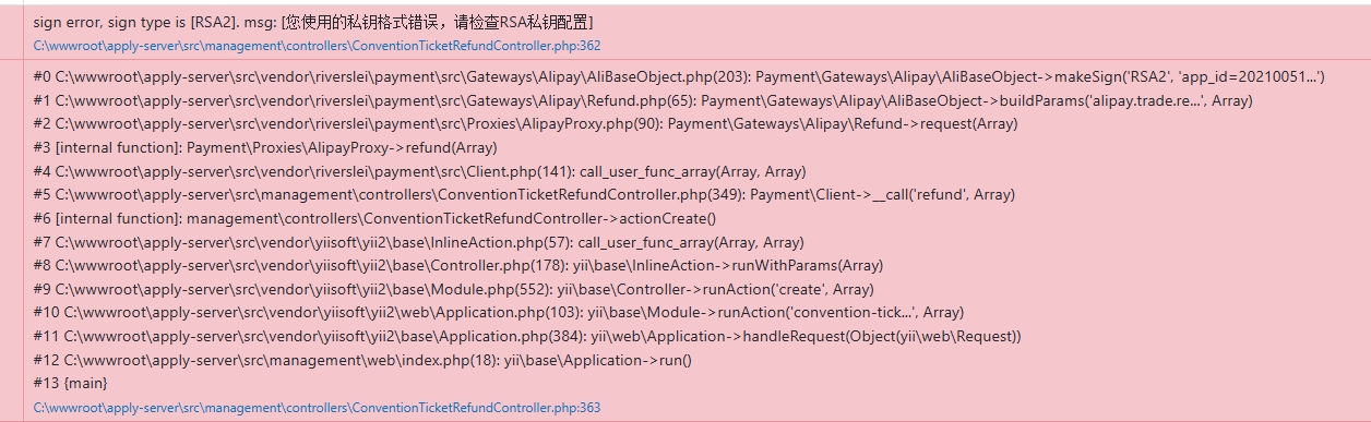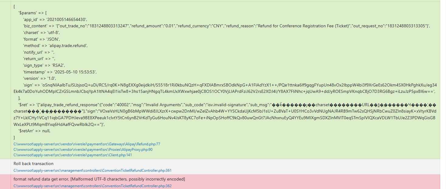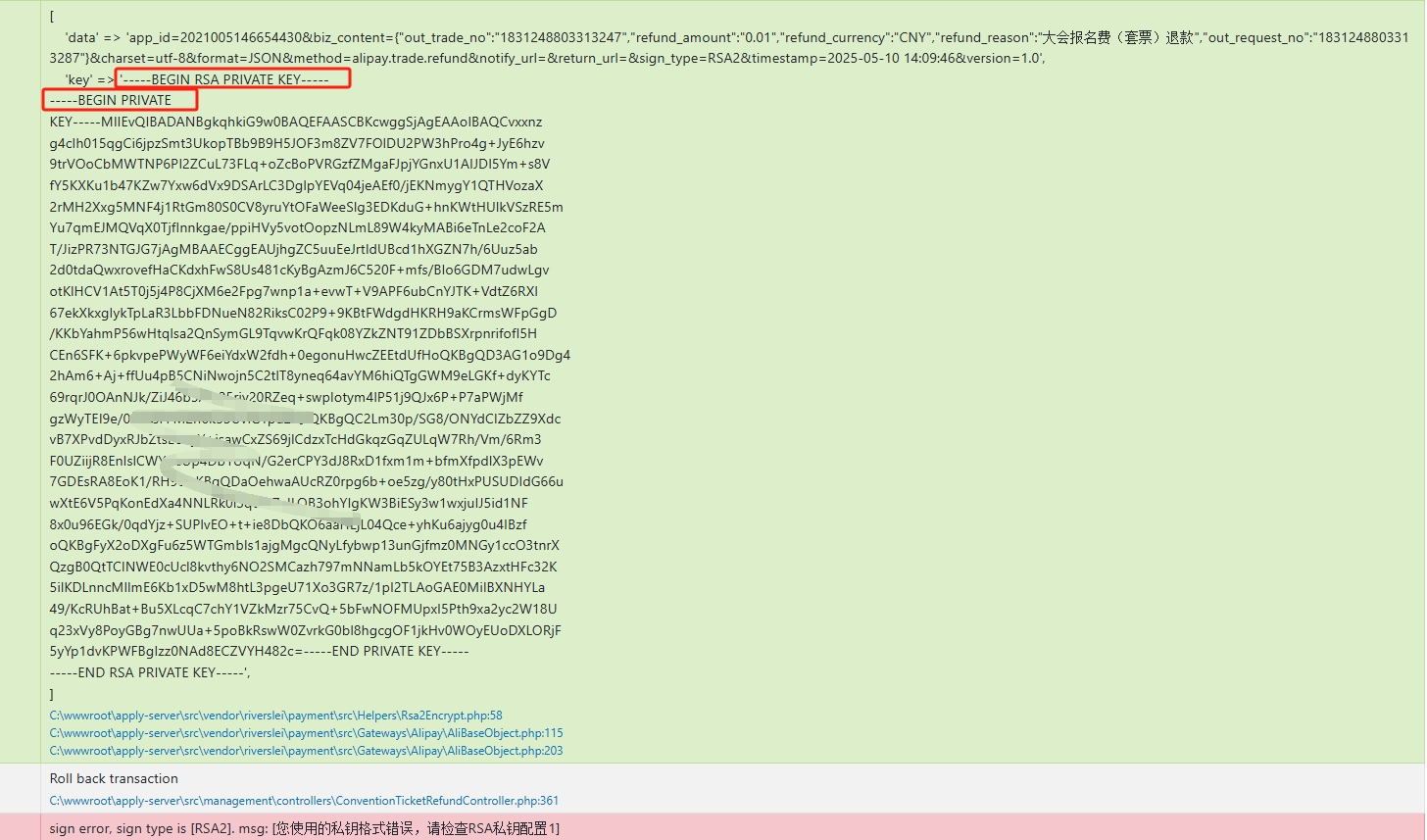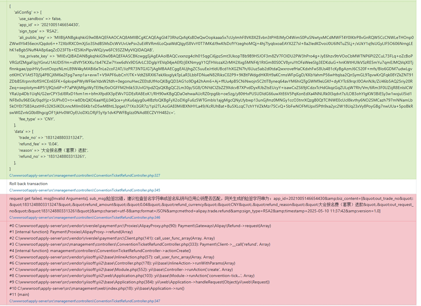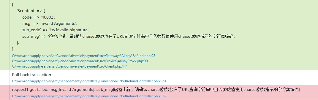 1、在基于 riverslei/payment 实现支付宝退款时,报错:request get failed, msg[Invalid Arguments], sub_msg[验签出错,建议检查签名字符串或签名私钥与应用公钥是否匹配。如图1