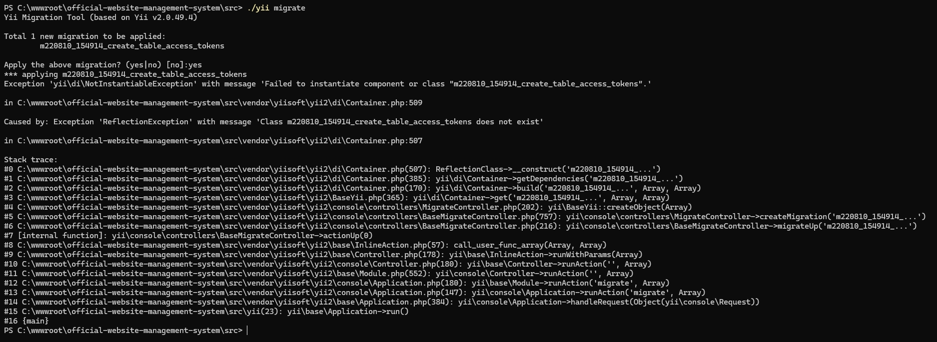 在 Yii2 中执行数据库迁移时报错:Exception ‘yii\di\NotInstantiableException’ with message ‘Failed to instantiate component or class “m220810_154914_create_table_access_tokens”.’