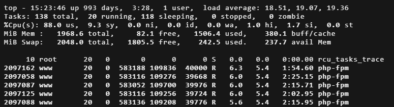 top - 15:21:01 up 993 days, 3:25, 1 user, load average: 18.68, 19.55, 19.55 Tasks: 139 total, 20 running, 119 sleeping, 0 stopped, 0 zombie %Cpu(s): 88.0 us, 9.0 sy, 0.0 ni, 0.0 id, 0.0 wa, 1.3 hi, 1.7 si, 0.0 st MiB Mem : 1968.6 total, 76.8 free, 1481.2 used, 410.6 buff/cache MiB Swap: 2048.0 total, 1816.6 free, 231.4 used. 262.7 avail Mem