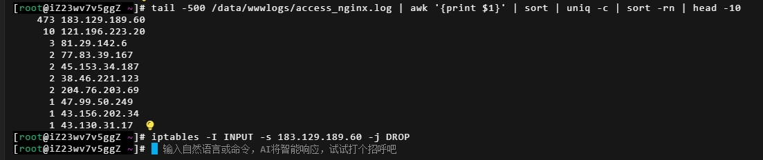 [root@iZ23wv7v5ggZ ~]# tail -500 /data/wwwlogs/access_nginx.log | awk '{print $1}' | sort | uniq -c | sort -rn | head -10