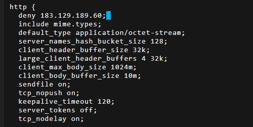 15、由于 iptables 不管用,在 Nginx 层面封。直接在 access_nginx.log 对应的那个虚拟主机配置里封。先找到是哪个虚拟主机。然后直接编辑 nginx.conf,保存后,重启 Nginx。如图7