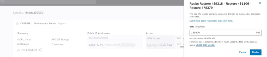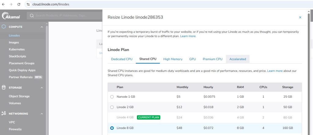 1、发现 Linode 实例可以调整大小了。发现当前 Linode 4 GB,存储是 80GB。可以调整为 Linode 8 GB ,存储是 160 GB。如图1