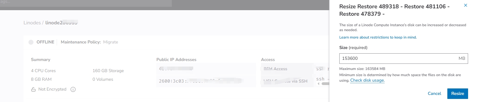 1、发现 Linode 实例可以调整大小了。发现当前 Linode 4 GB,存储是 80GB。可以调整为 Linode 8 GB ,存储是 160 GB。如图1