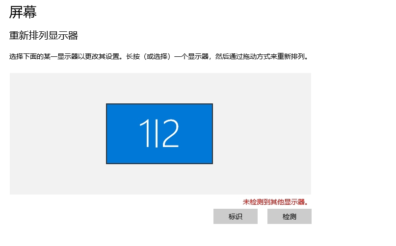 3、但是,现在 重新排列显示器 已经显示 1 2 两个显示器了。可是 vga 显示器上仅显示:检测信号线。如图3