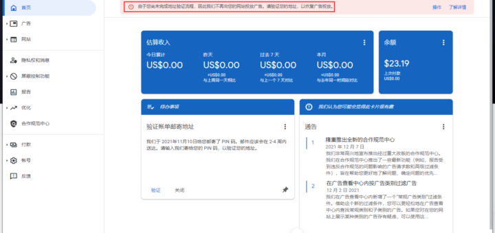 1、Google Adsense 由于您尚未完成地址验证流程,因此我...