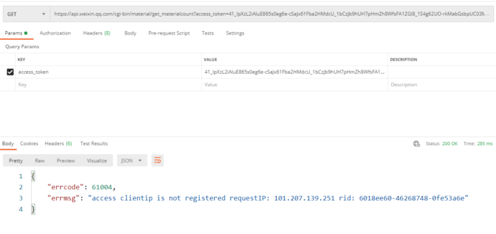 基于微信第三方平台获取微信公众号素材总数时响应:access clientip is not registered requestIP: 101.207.139.251 rid: 6018ee3e-537e89cc-65c6e6b9 的排查分析