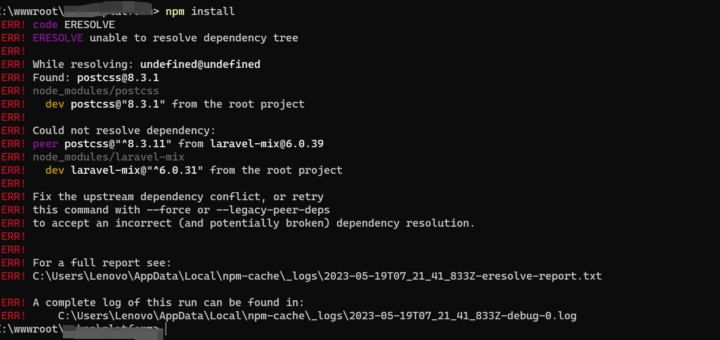 在 Laravel 6 中,安装 Laravel Mix 时(npm install),报错:npm ERR! ERESOLVE unable to resolve dependency tree