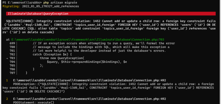 1、添加外键约束时报错: SQLSTATE[23000]: Inte...