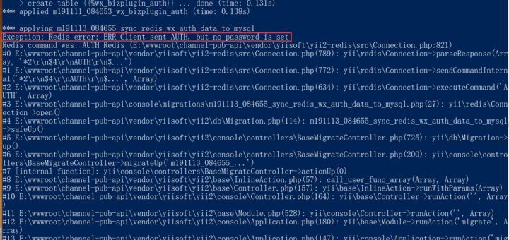 在 Yii 2.0 的数据库迁移时报错:Exception: Redis error: ERR Client sent AUTH, but no password is set
